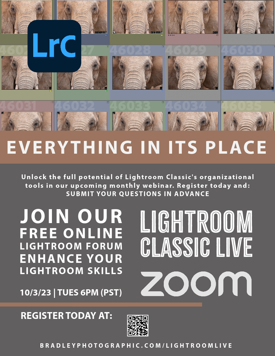 Our next meeting, titled "Everything in it’s Place," will take place on Tuesday, October 3rd at 6:00PM (PT). This episode will focus on the organizational strengths of Lightroom and will equip you with the essential techniques to keep your digital photography world organized and stress-free.