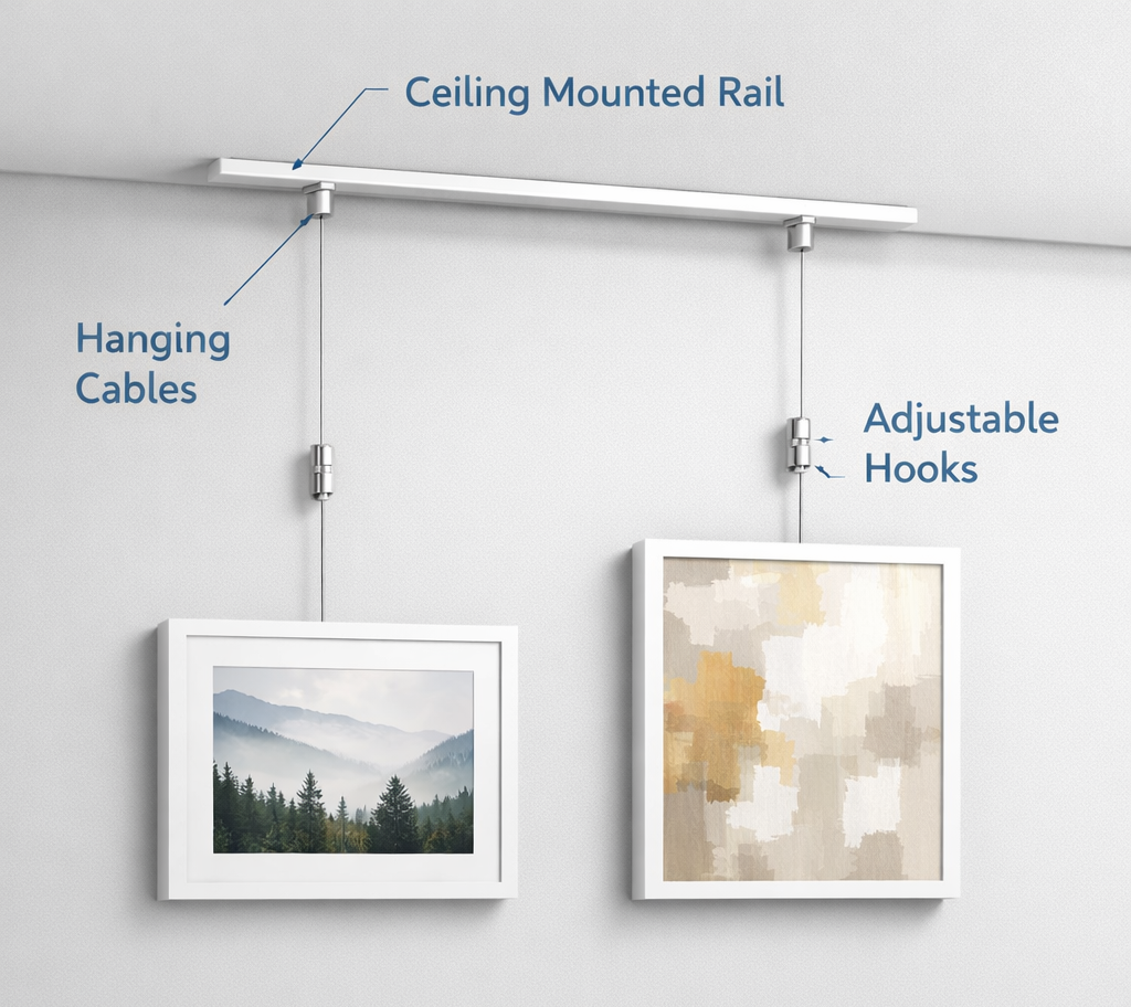 Cables or Rods – The vertical suspension element that supports the artwork.