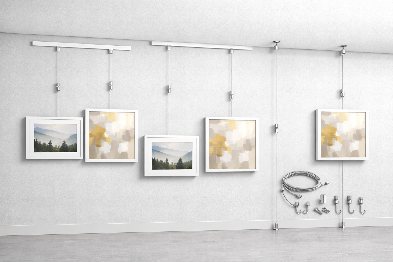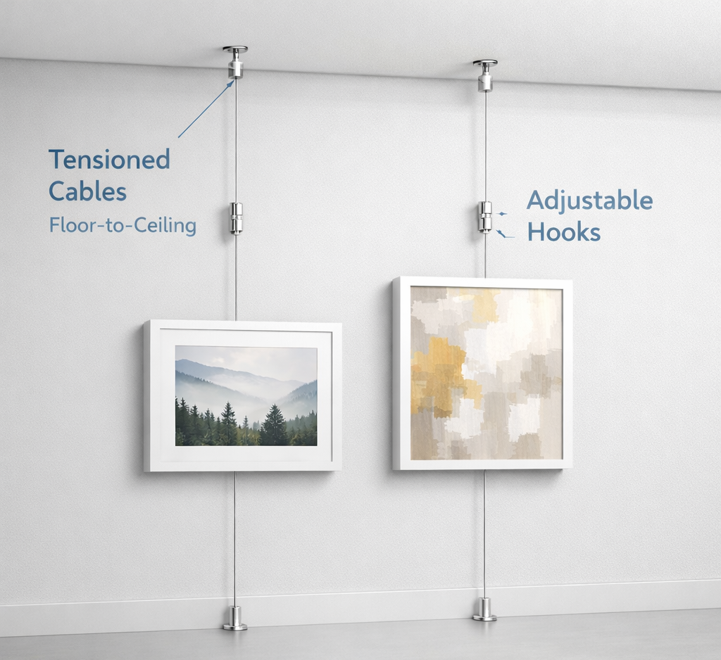 Our gallery and art hanging systems are designed to make displaying artwork simple, flexible, and damage-free. Whether you’re installing a professional gallery wall, refreshing a home display, or creating a commercial presentation space, each system is built around the same core concept: a secure top support, adjustable cables, and precision hooks.