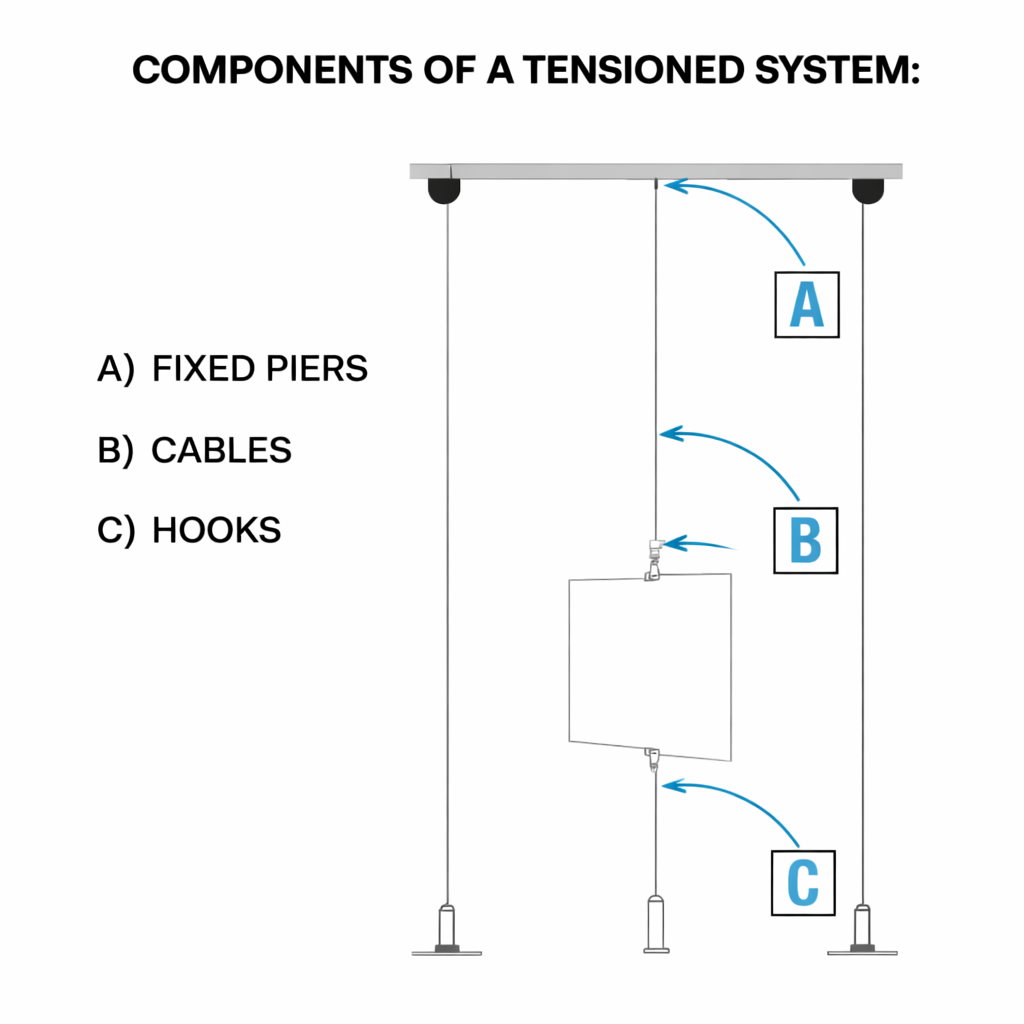 Tension Systems are where cables are tensioned between two piers. Ideal for mounting panels, 3D objects, and acrylic pockets. Secure, stylish and adaptable for any space.